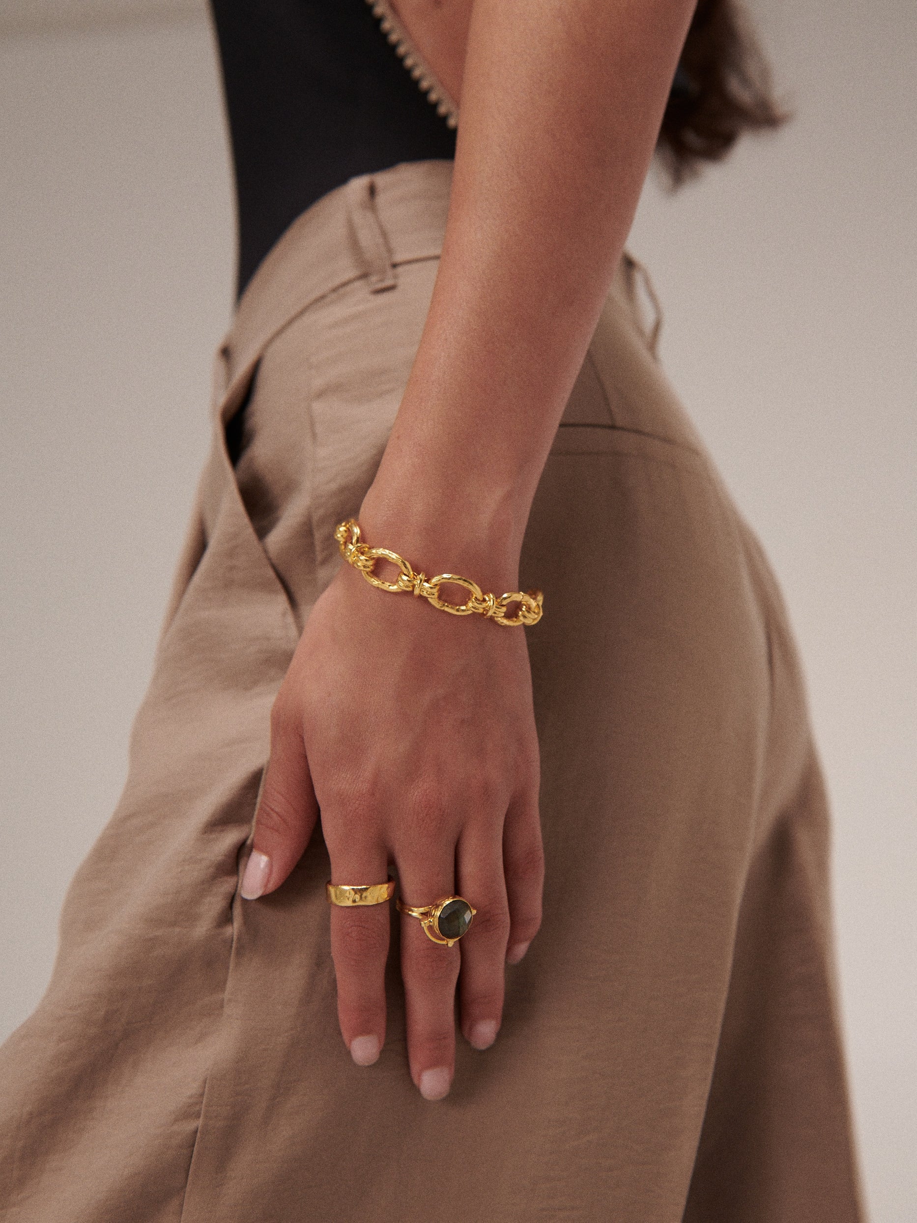 Inspirert av tidløse antikke design som aldri går av moten, har Zehra Chain-armbåndet dristige gull-lenker og en hamret overflate. Lengden kan enkelt justeres for å passe deg perfekt. Zehra-armbåndet er bærekraftig håndlaget ved verkstedet i Istanbul, av 21 karat gullforgylt resirkulert messing.