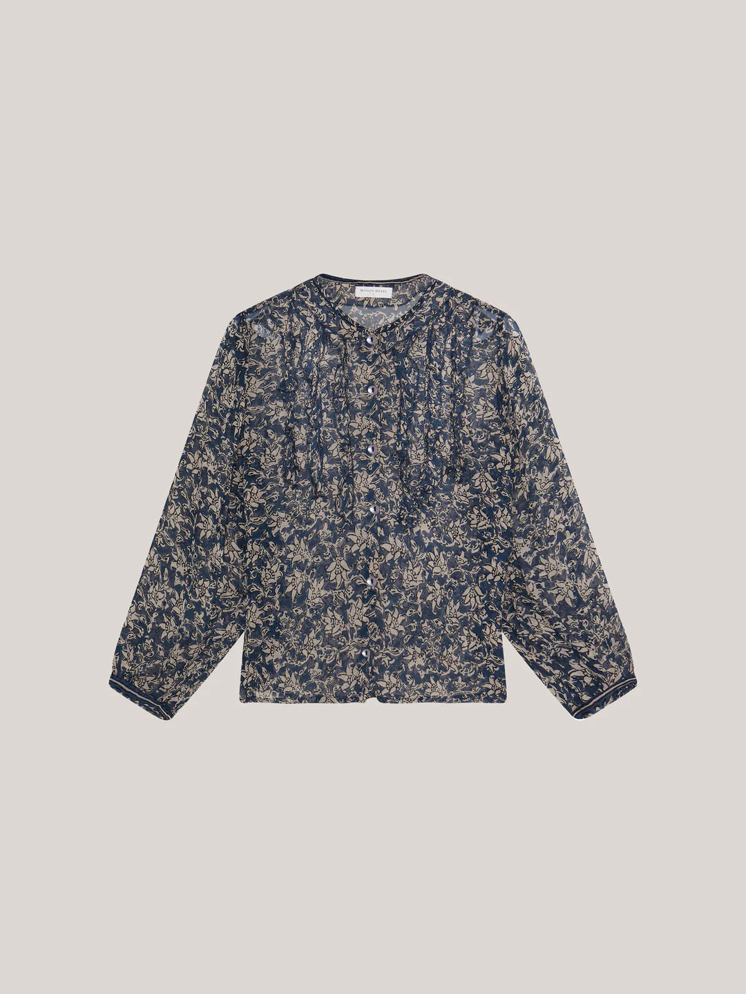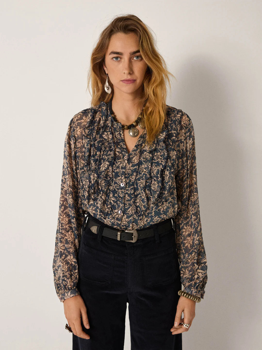 Blusen er laget i georgette-viskose – lett, luftig og delikat transparent. Corina-blusen har et print med sandfargede blomster mot en dyp blågrønn bunn, som gir et mykt og raffinert uttrykk. Fine volanger rammer inn fronten og tilfører bevegelse og dybde til stoffet.