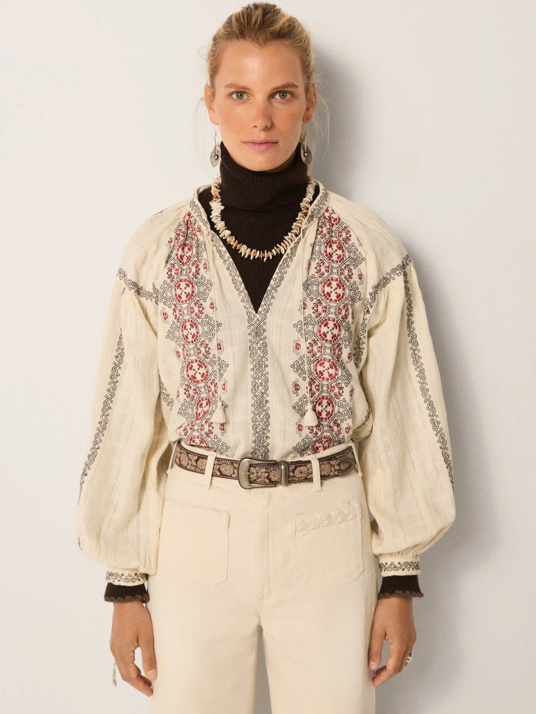 Her stylet over en Dolcevita-genser og ned i Hamlet Ecru-buksen med Guadalupe-beltet – tradisjonelt håndverk gjenfortolket for hverdagsbruk. Blusen passer også fint med denim for en mer avslappet look.