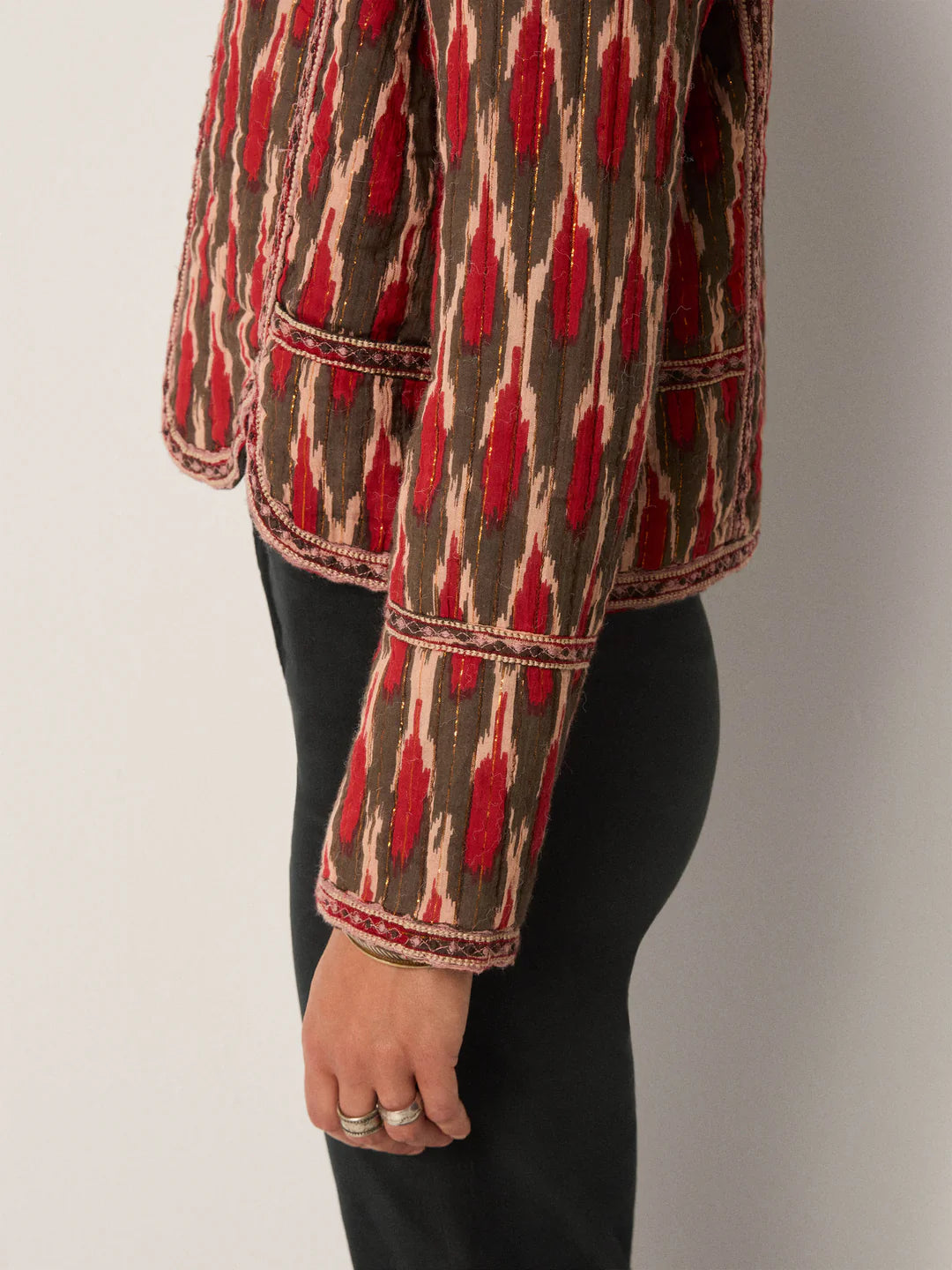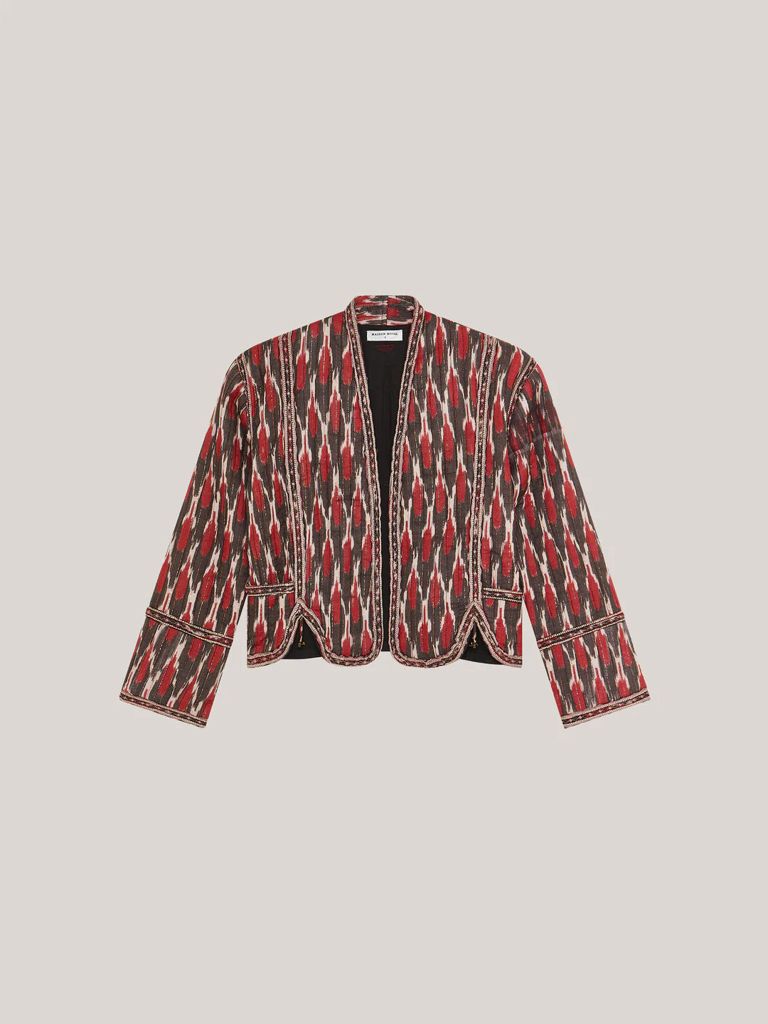 Silhuetten er avslappet, men strukturert, med lukning foran og lett vattering for ekstra komfort. Langs kantene løper delikate broderier som tilfører en håndverksmessig tekstur og løfter plagget uten å gjøre det prangende.
