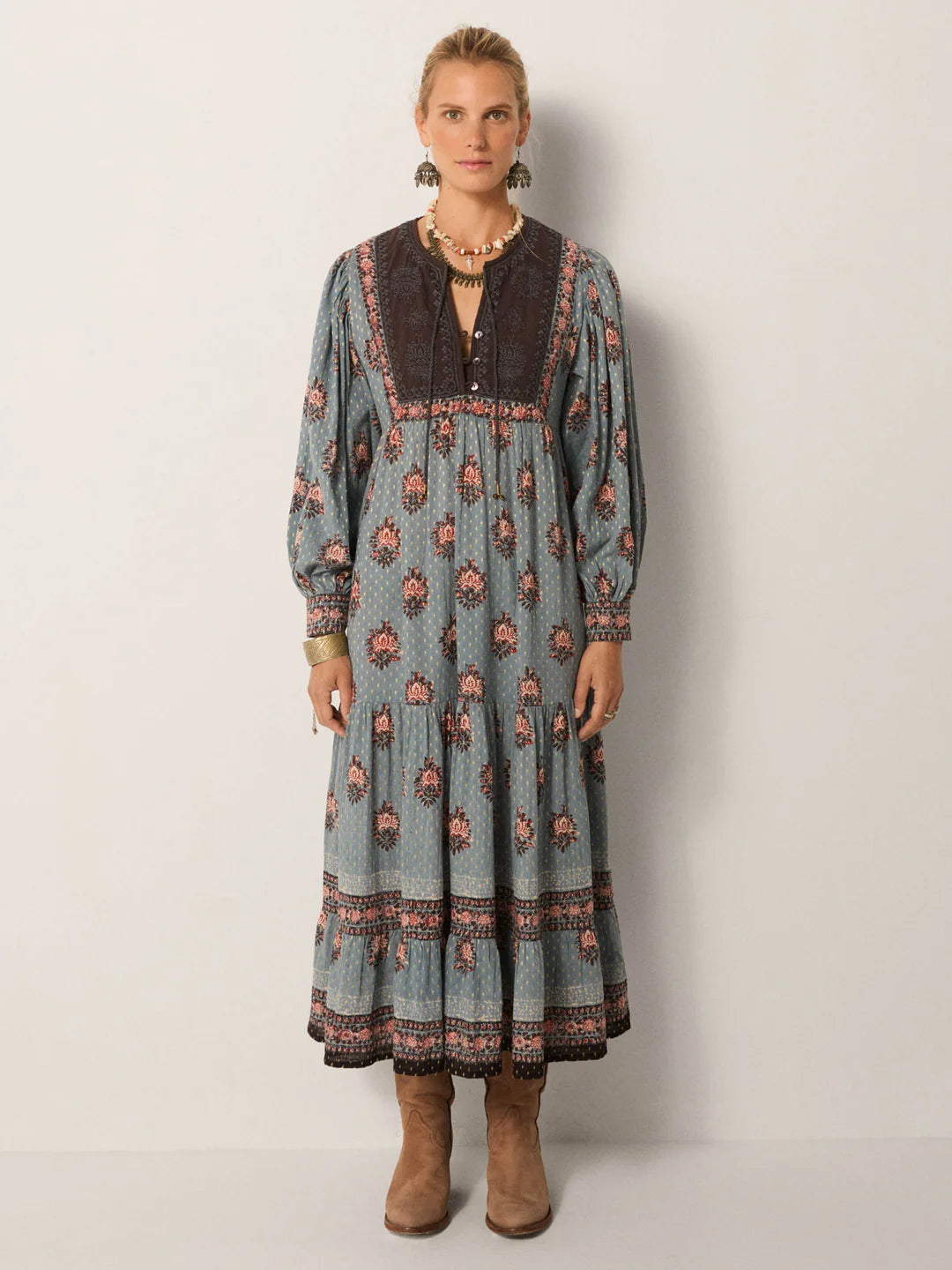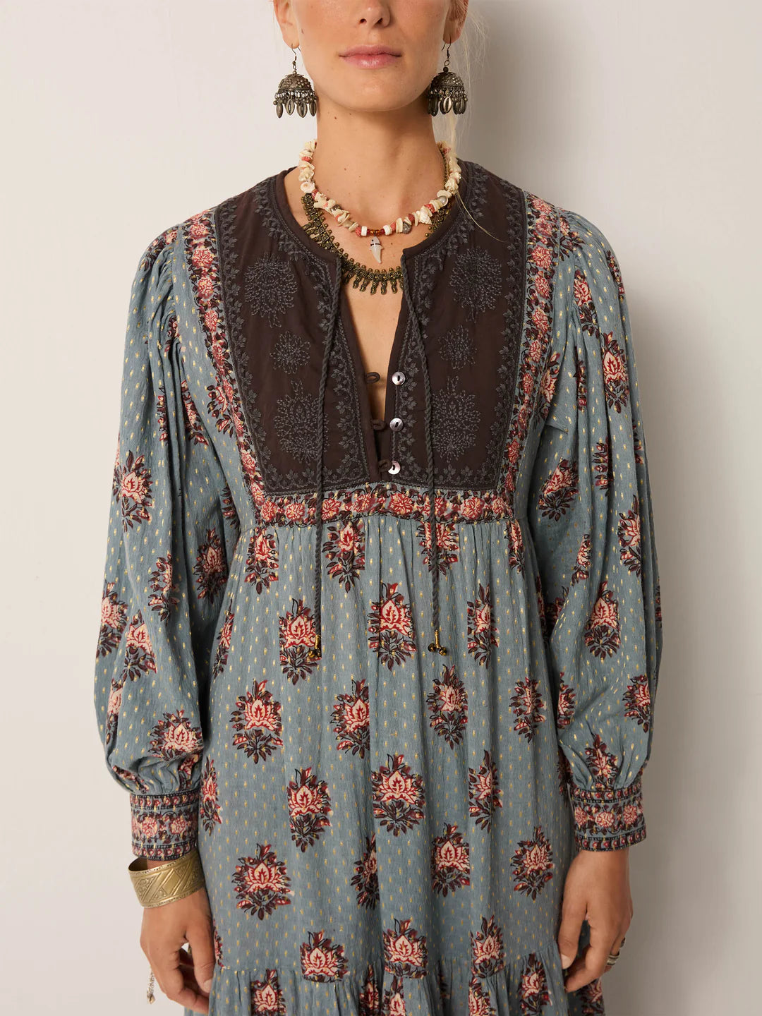 En kjole i bomullskrepp som faller lett og ledig. Den blå tonen minner om keramikk – myknet og dempet – mens små, gyldne prikker glimter diskret i lyset.