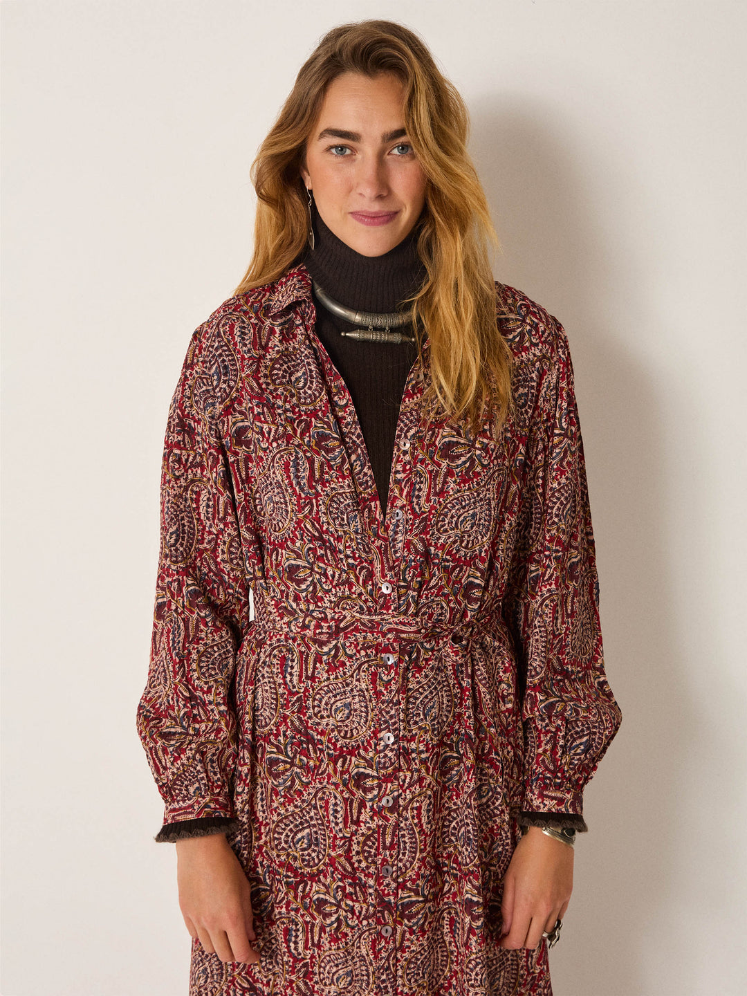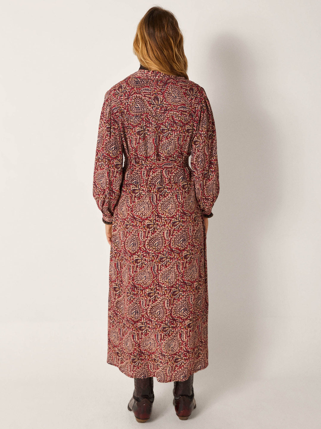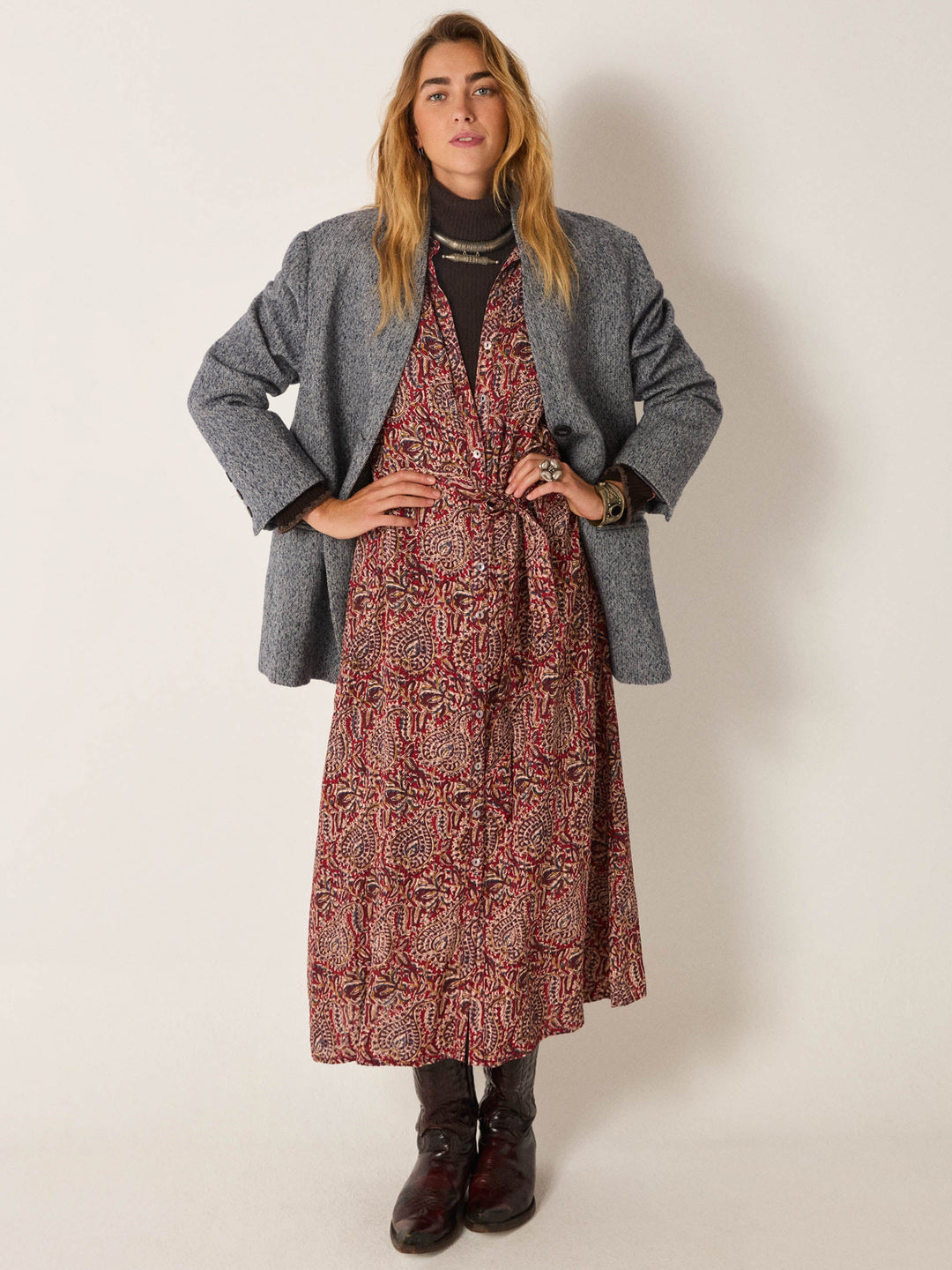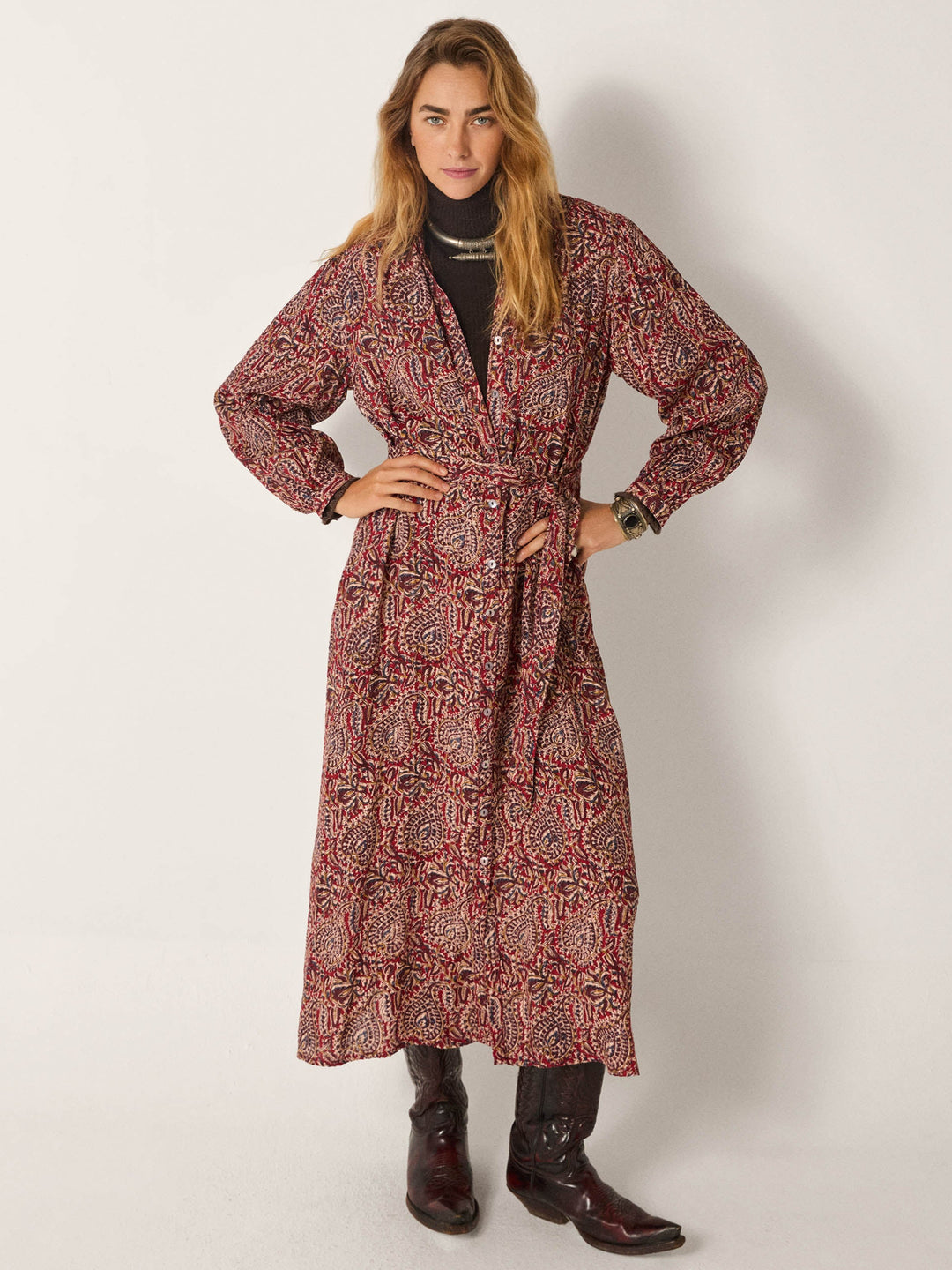 Printet i varme toner av burnt amber, blått, rustrødt og pudderrosa gir kjolen et levende, men balansert preg – sofistikert nok til fest, men også anvendelig i hverdagen.