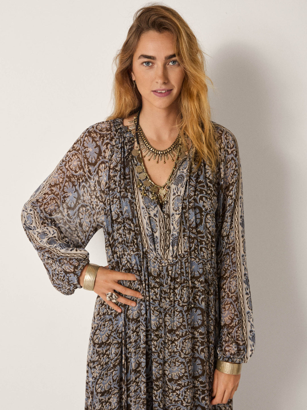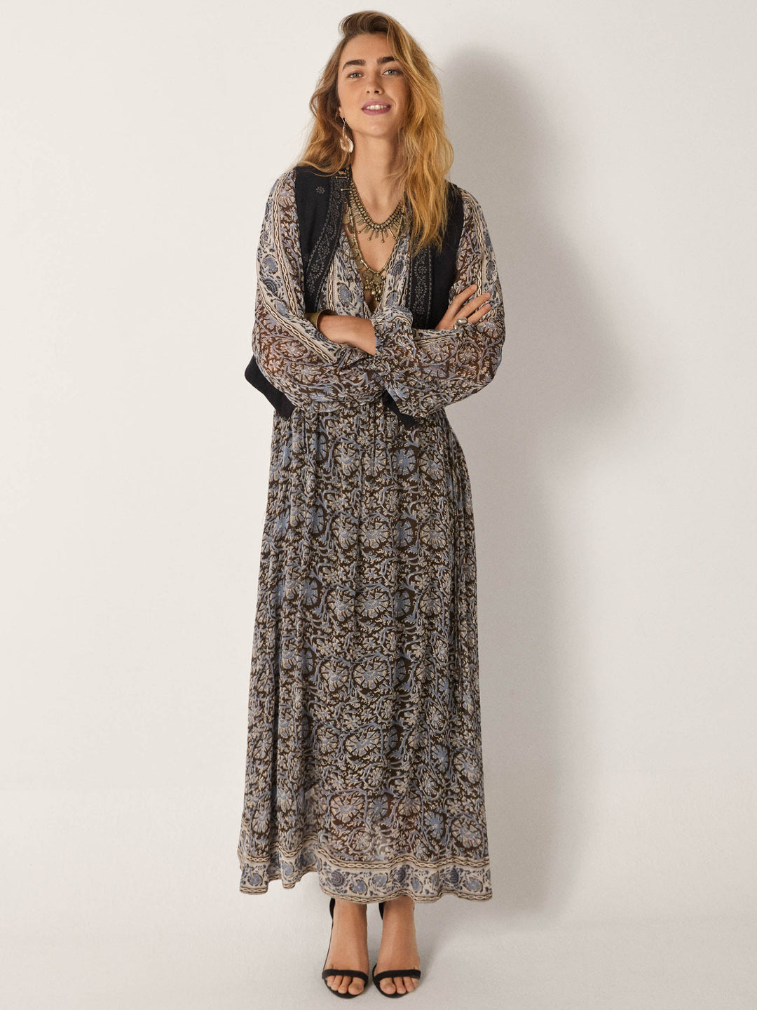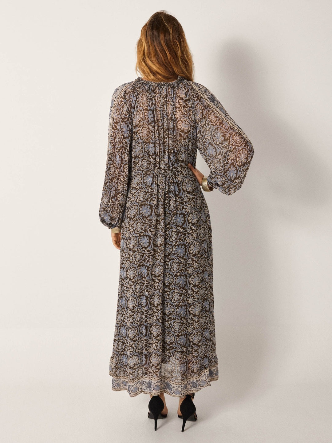Kjolen har lange ermer med løse volanger, samt ekstra volangpaneler langs armene som skaper bevegelse og rytme. Den lange silhuetten understreker det feminine, mens kragen kan bæres åpen eller kneppet igjen for å variere uttrykket.