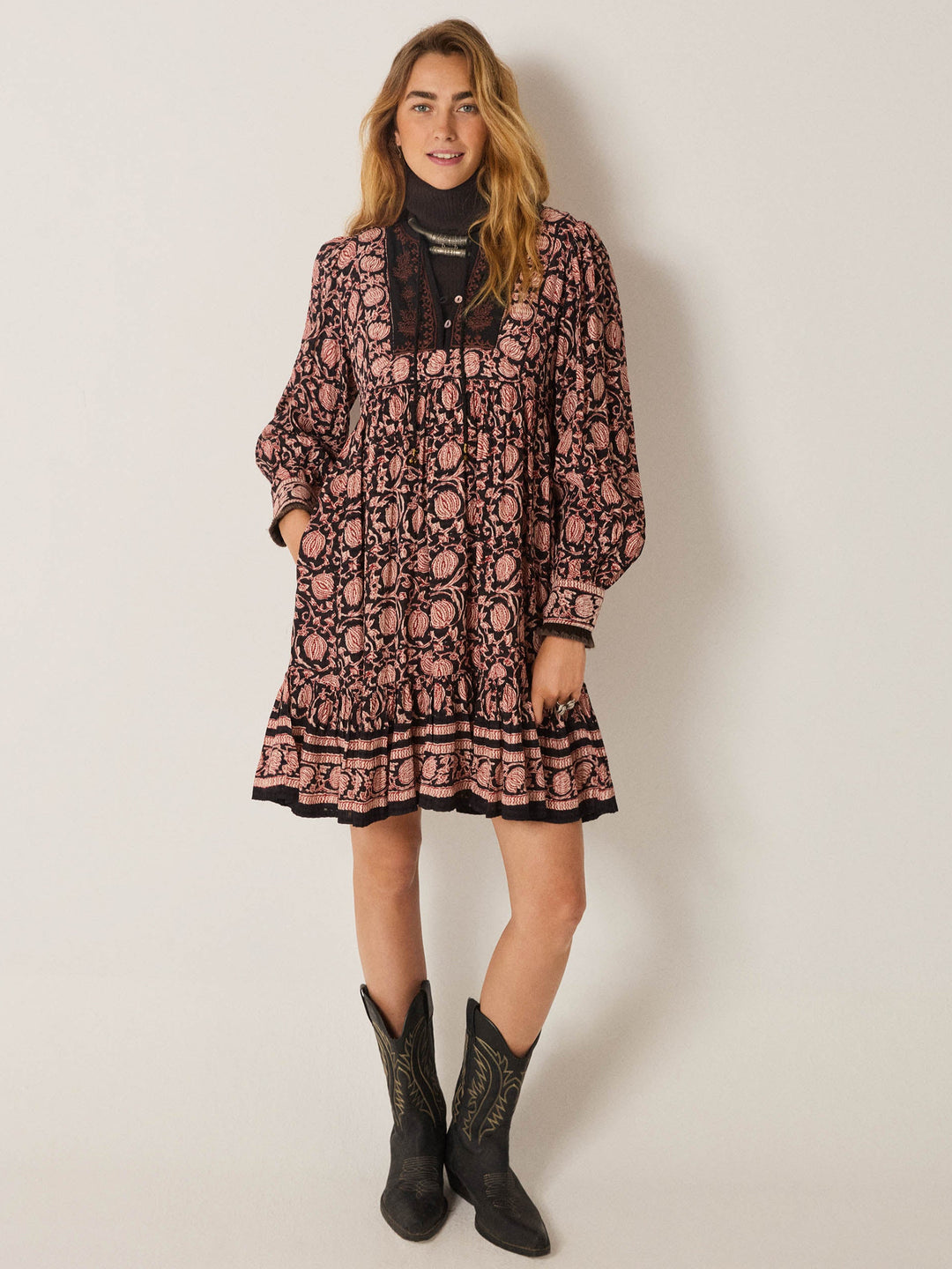 Et vakkert brodert forstykke gir kjolen dybde og et sofistikert preg, mens den knelange lengden og lange ermer med diskrete rynker ved mansjettene tilfører bevegelse og balanse til silhuetten.