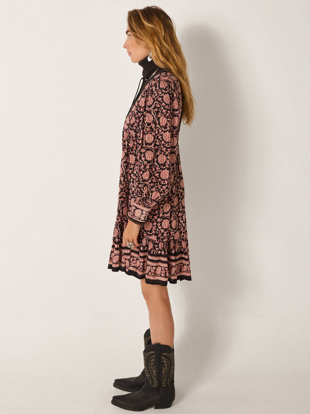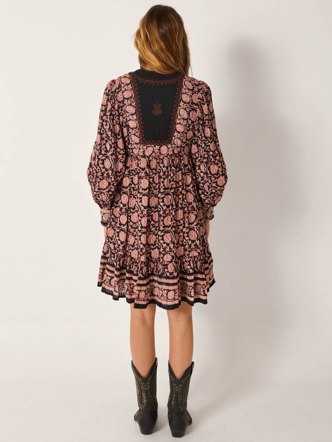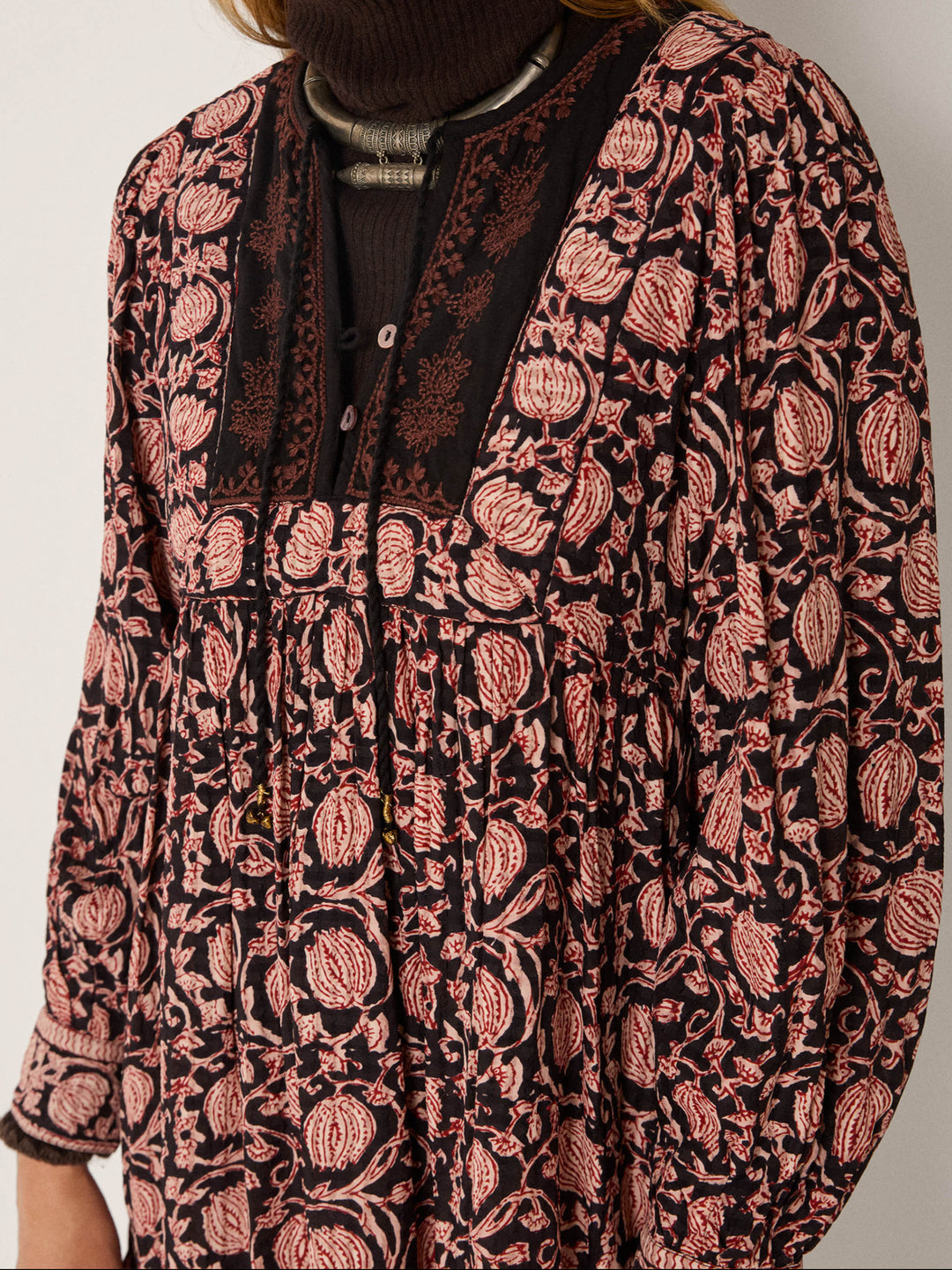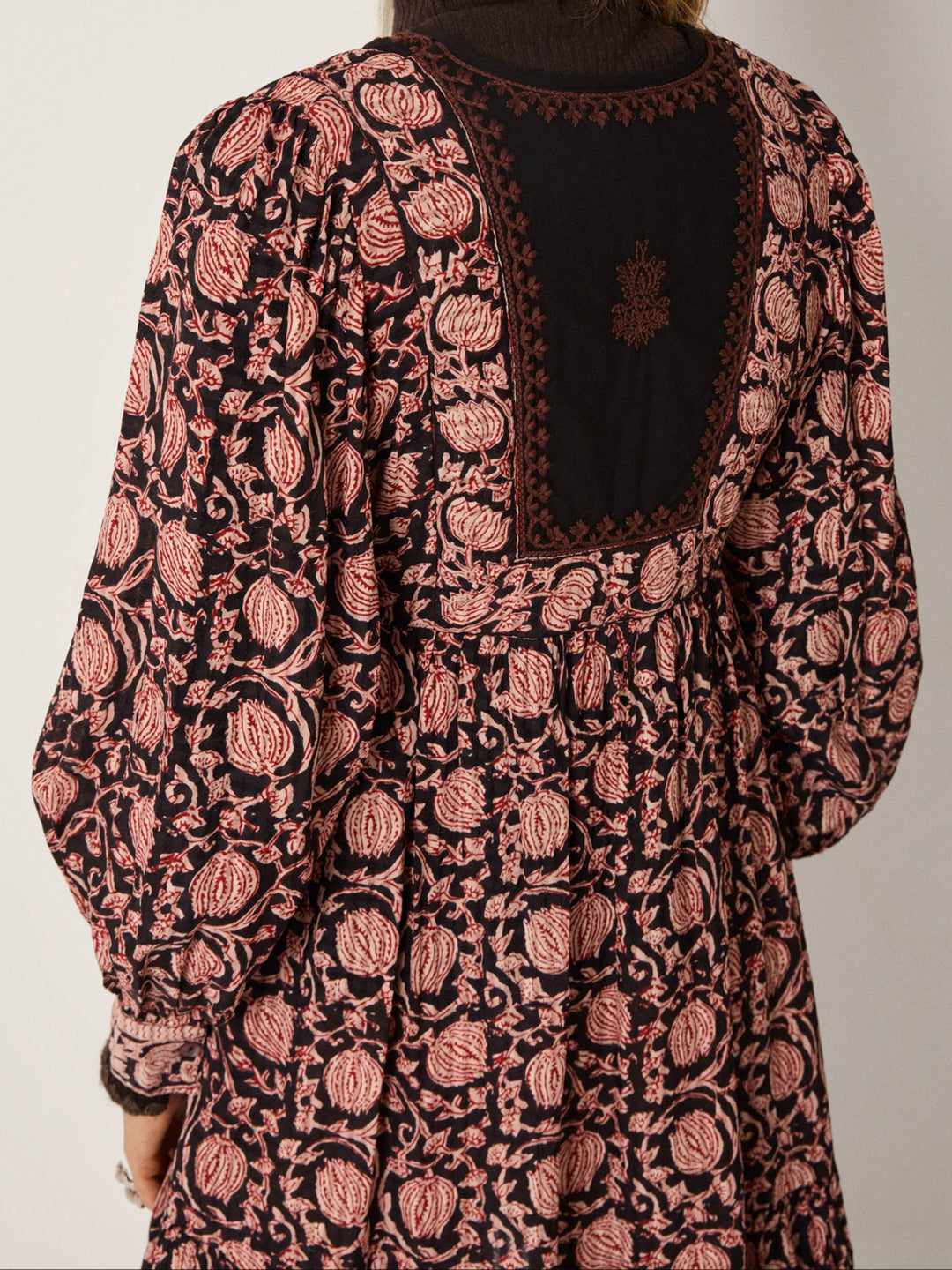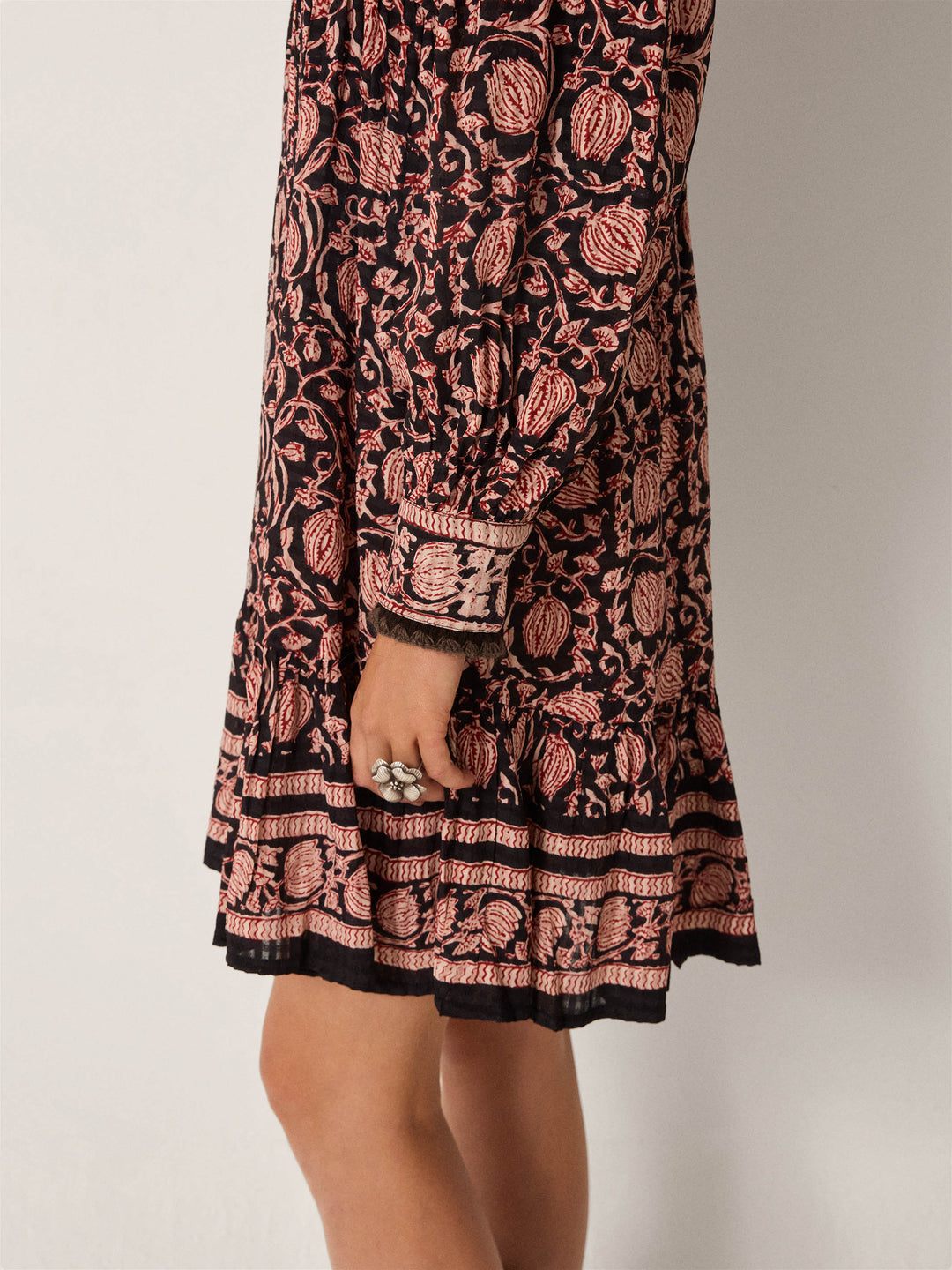 Denne kjolen er laget i myk bomullskrepp med en lett og luftig følelse, samtidig som stoffet har nok struktur til å fremheve mønsteret. Det kunstneriske printet med vinranker og granatepler folder seg ut over den mørke basen i varme toner av terrakotta, rust og pudderrosa, som et levende fortellende motiv.
