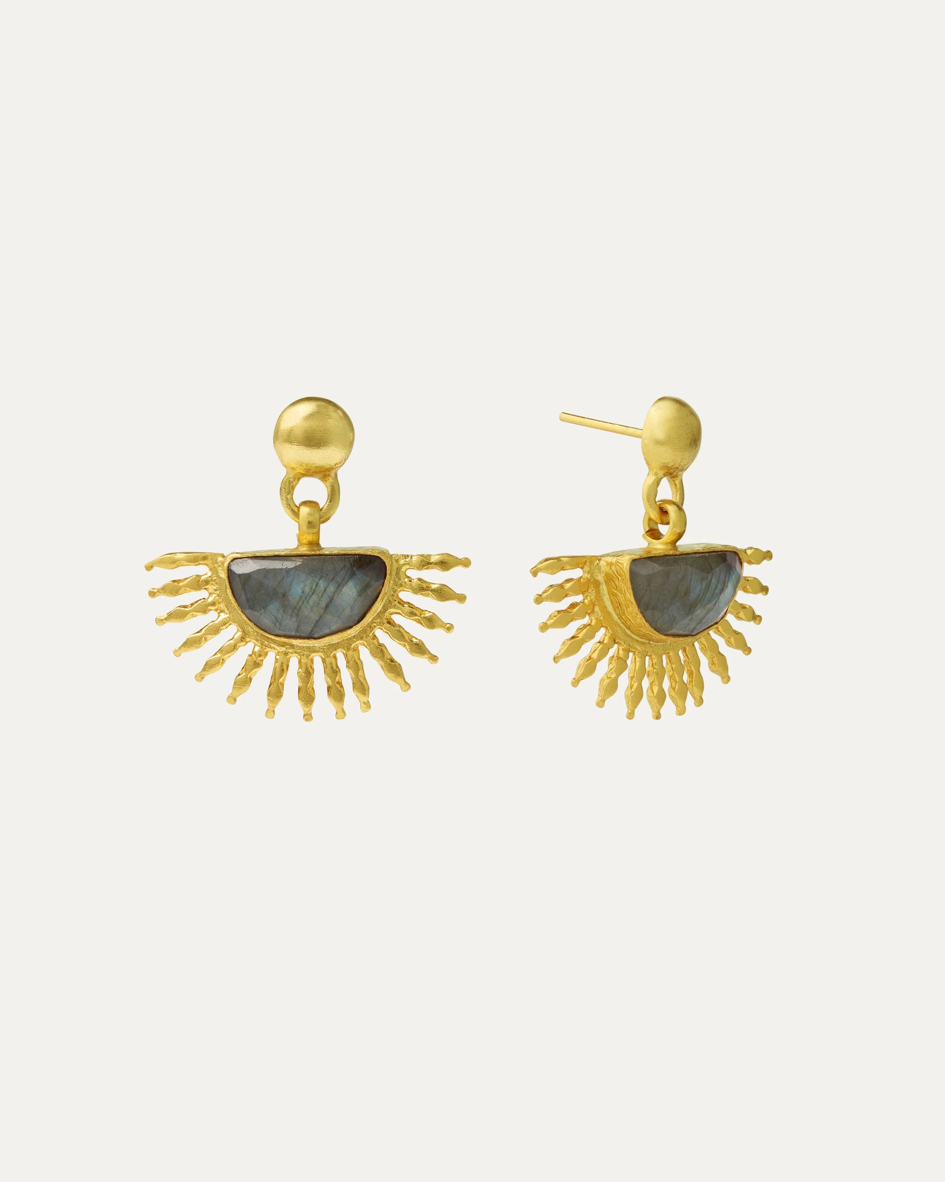Disse edelstensøredobbene, som minner om gyldne solstråler, vil gi garderoben et lyst preg. Håndsatt med fasettert labradoritt, har øredobbene en luksuriøs finish i hamrede tekstur. Ørestiftene er gullbelagt på sterlingsølv og festes med sommerfugl-lås.