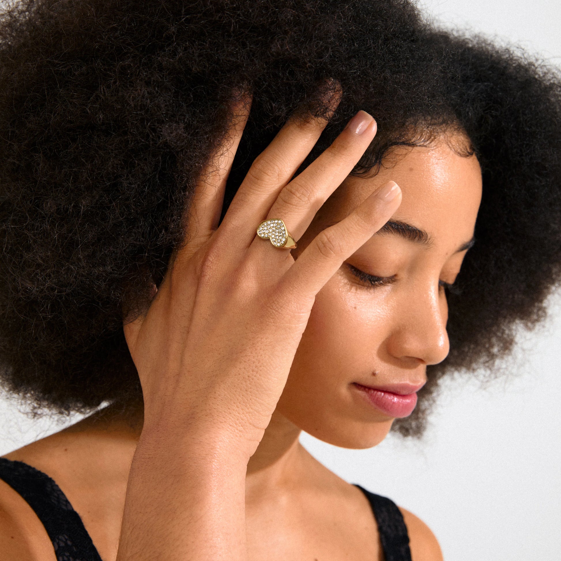 Shine with love! Gullbelagt ring med et stort hjerte dekorert med glitrende Preciosa-krystaller – et iøynefallende piece som gir maksimal sprarkle og romance til looken din. Bruk den som et statement-piece alene, eller kombiner med flere ringer for en stacked look med ekstra wow-effekt. En ring som løfter outfitet ditt til next level! Ringen har en justerbar størrelse for optimal passform og er laget av 98 % resirkulert materiale, med kjærlighet til vår felles planet.