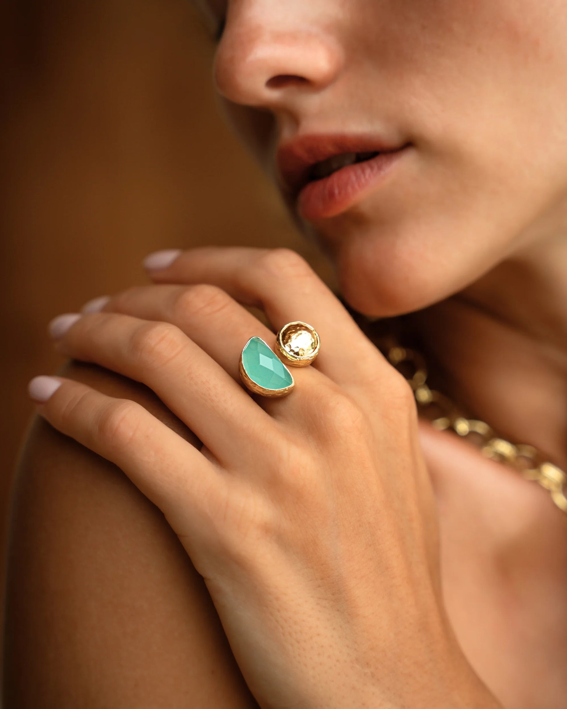 Mina Aqua Chalcedony Cocktail Ring kombinerer eleganse med jordnær sjarm. Ringen har en hamret gullsirkel, vakkert kontrastert med en livfull Aqua Chalcedony halvedelsten.