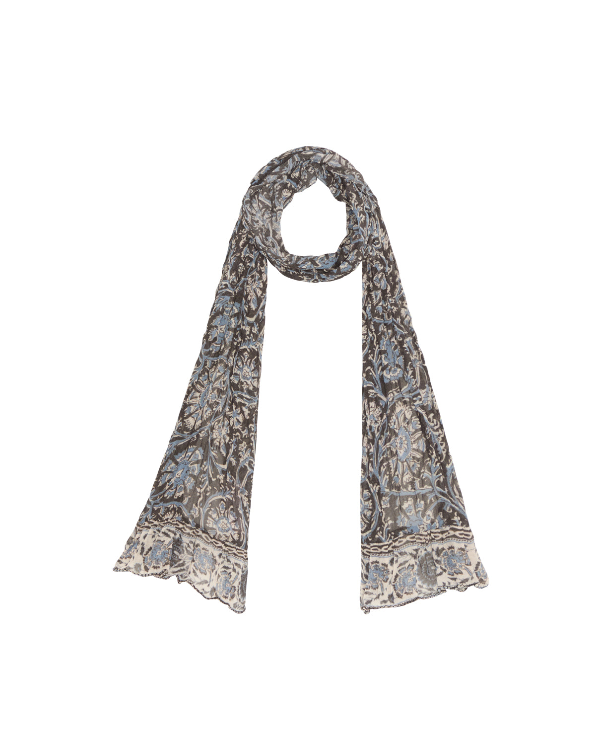 Et lett og nesten gjennomsiktig skjerf i georgette, som folder seg mykt som sidene i en gammel notatbok. Fargen minner om skumring – dempet og myk.