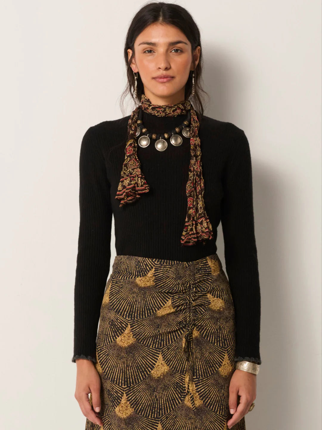 Et lett og gjennomsiktig skjerf i georgette-viskose med en diskret glans. Den mørke bunnfargen er dekorert med blomster- og kantemønstre i varme røde, oker- og mosstoner.