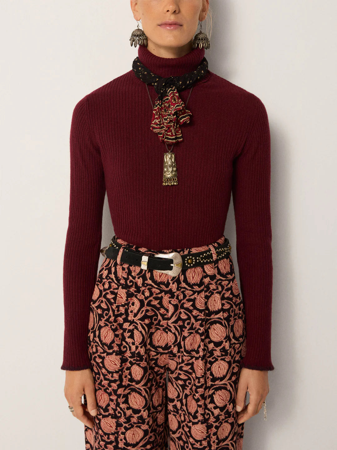 Et lett og gjennomsiktig skjerf i georgette-viskose med en diskret glans. Den mørke bunnfargen er dekorert med blomster- og kantemønstre i varme røde, oker- og mosstoner.