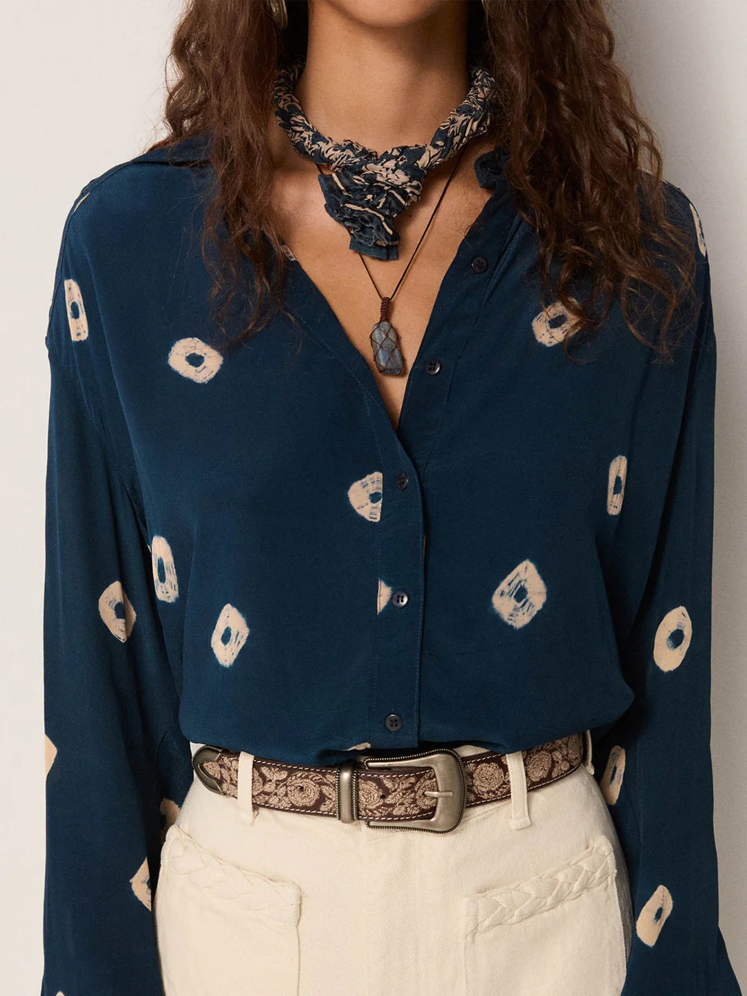 Her stylet i halsen på Aria-blusen og med Hamlet Ecru-buksen.