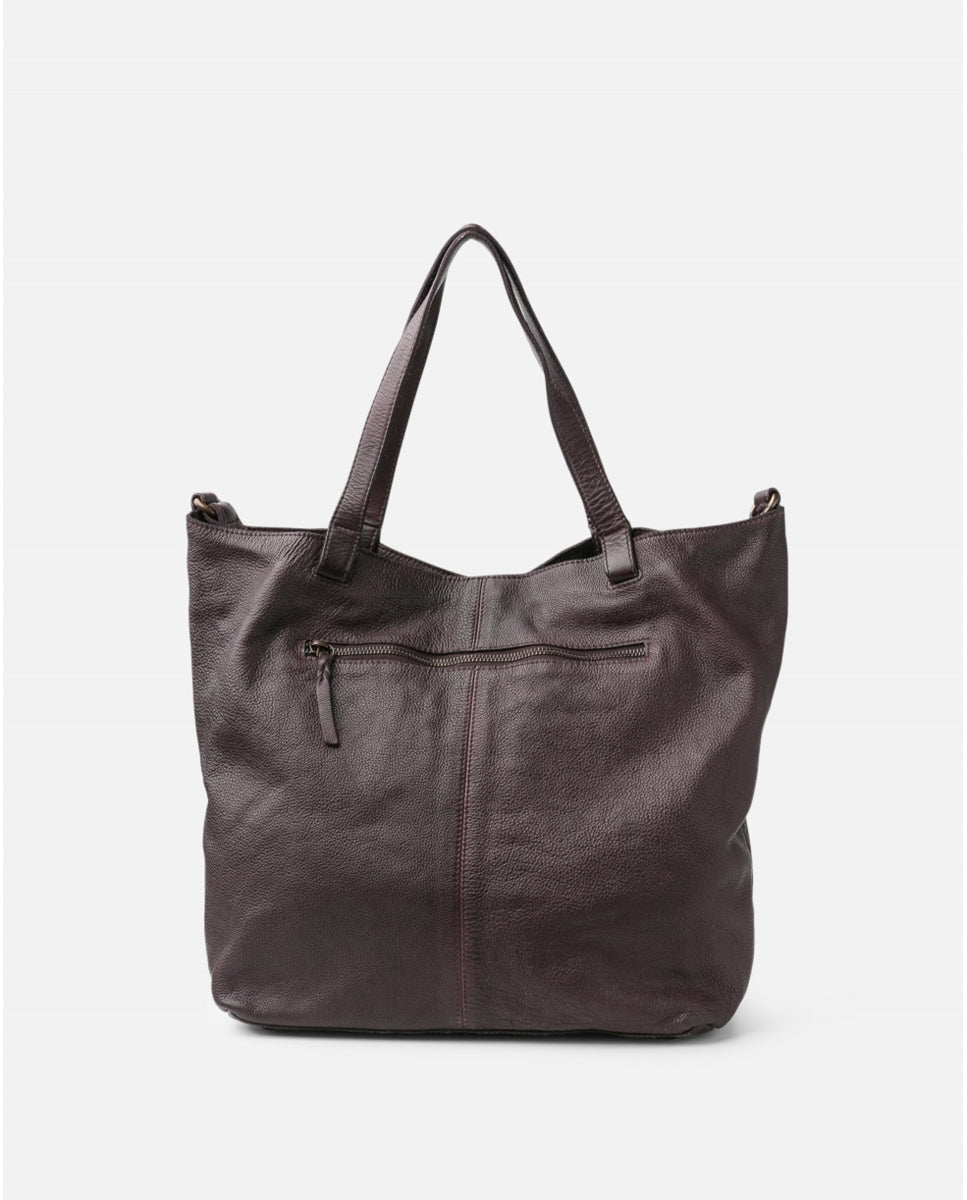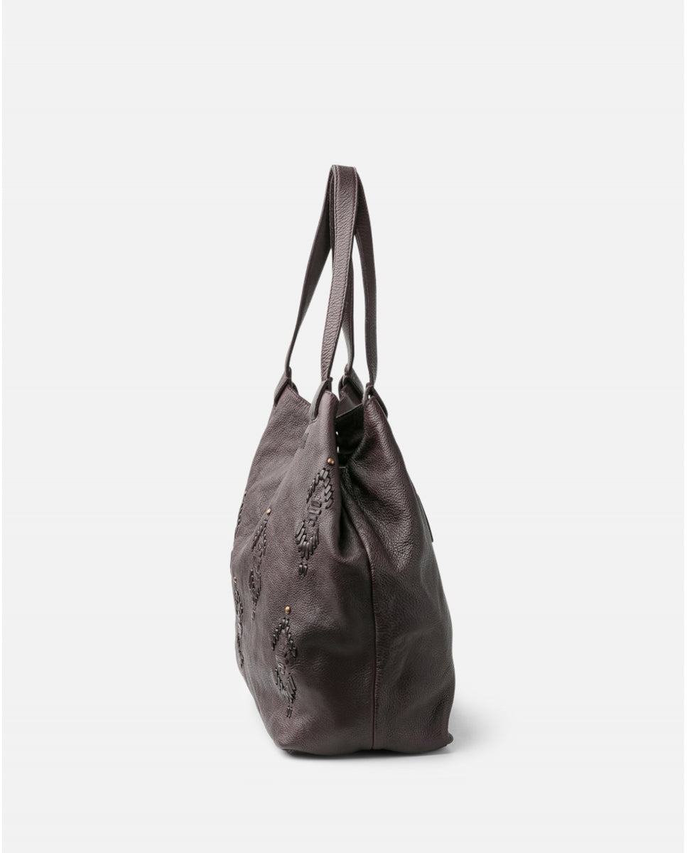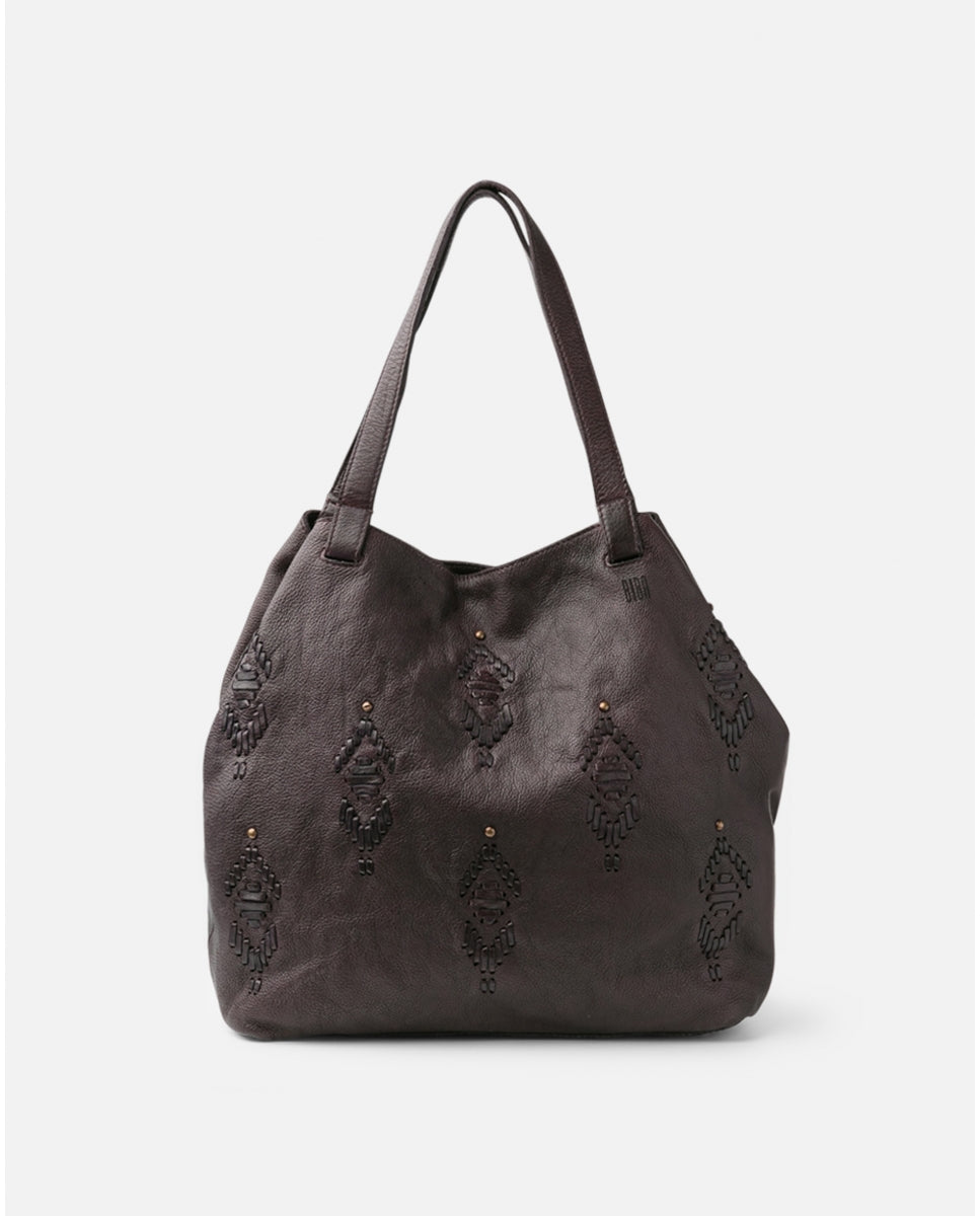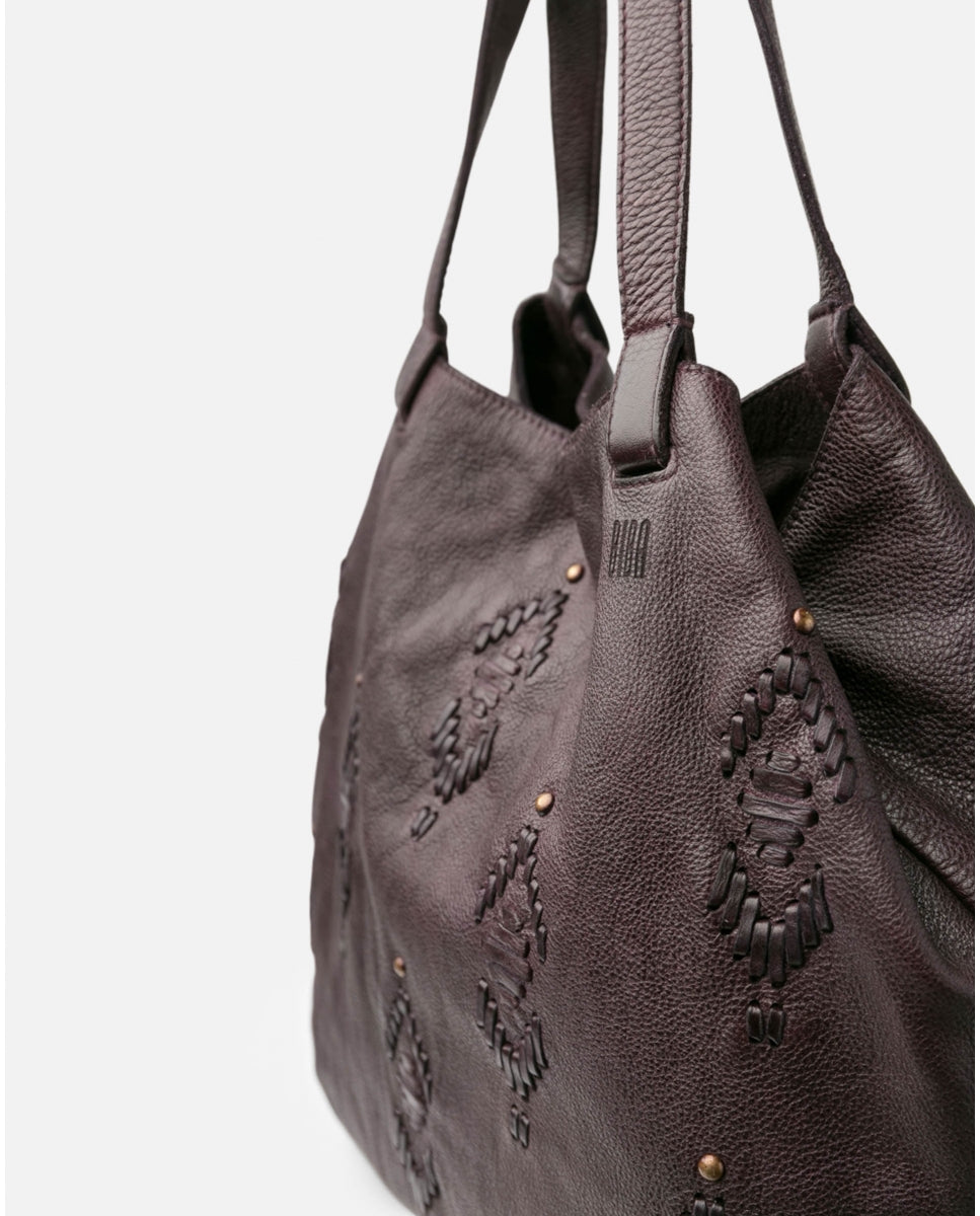 En romslig og karakterfull veske i ekte kuskinn, med dekorative nagler og tribal-inspirerte sømmer på fronten som gir et unikt uttrykk. Vesken har sentral knappelukking, og side- og ringdetaljer gjør det mulig å justere åpningen. Flere innvendige og utvendige lommer gir praktisk oppbevaring, mens bomullsfôret sikrer et gjennomført og holdbart design.