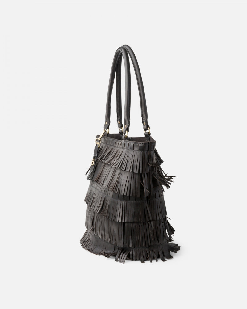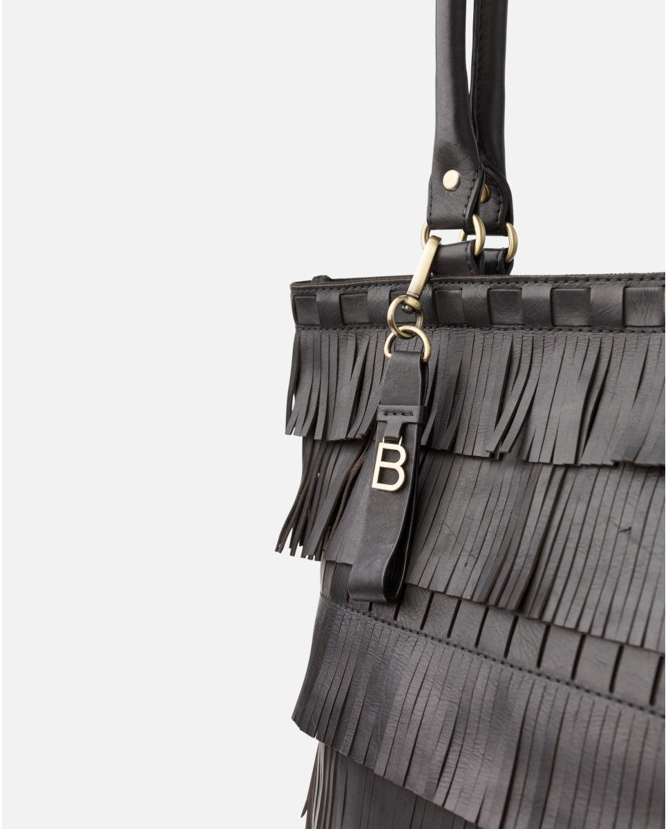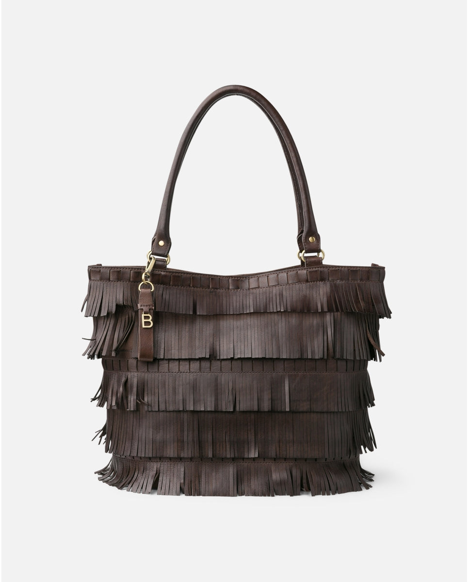 En romslig og karakterfull veske i ekte kuskinn, med dekorative frynser som gir et bohemsk preg. Vesken har knappelukking, innvendige lommer og er helfôret med bomull – perfekt både til hverdagsbruk og helgeturer.