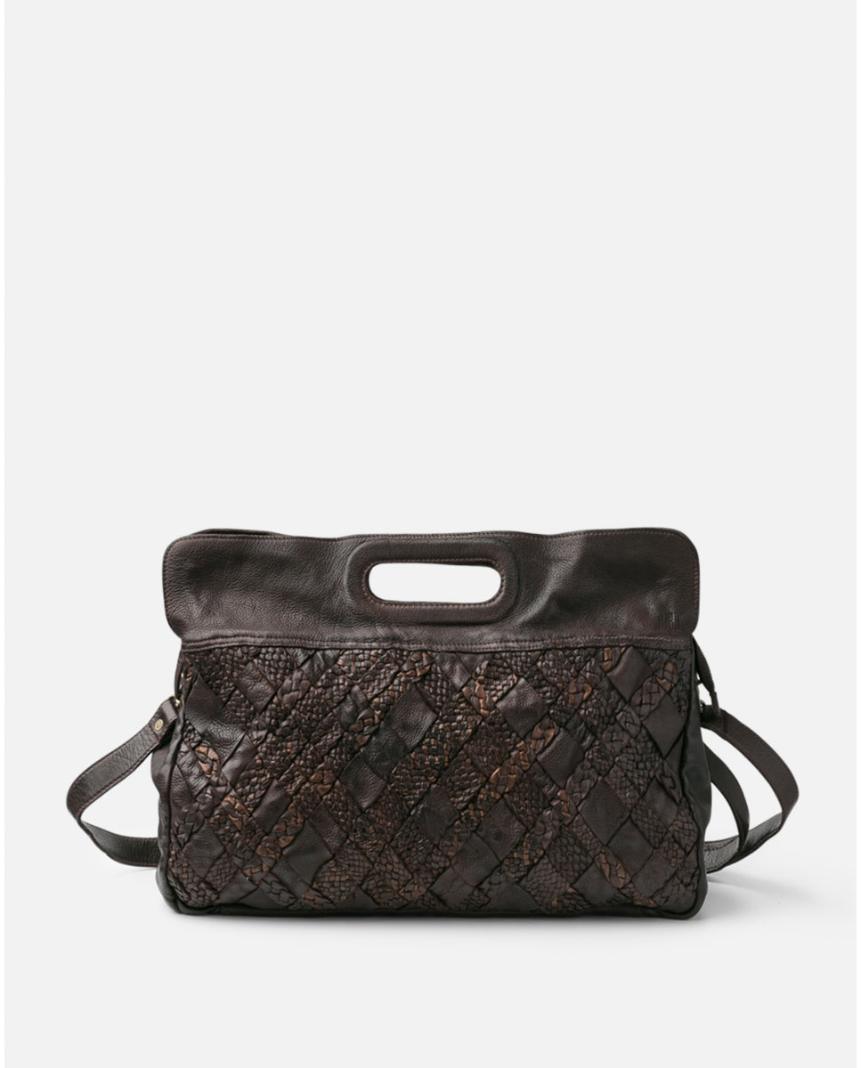 En eksklusiv veske i ekte kuskinn, med flettede detaljer på fronten som skaper et unikt og håndverksmessig uttrykk. Vesken har solid bærehåndtak, justerbar og avtakbar skulderrem, glidelåslukking og to romslige hovedrom. Flere innvendige og utvendige lommer gir god organisering, mens bomullsfôret sikrer et mykt og holdbart interiør.