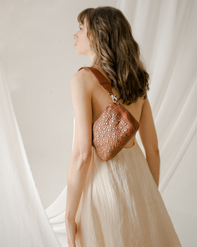 En stilfull og kompakt veske som kombinerer håndverk og moderne detaljer. Den kvadratiske formen og metallnaglene på fronten gir et trendy uttrykk, mens størrelsen gjør den perfekt til å bære det viktigste med stil. Vesken har glidelåslukking, avtagbar kort skulderrem og en justerbar crossbody-rem – slik kan du enkelt variere looken fra dag til kveld. Innvendige lommer og bomullsfôr gir både funksjonalitet og et gjennomført preg.